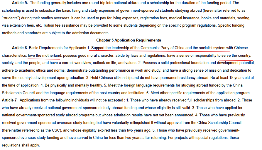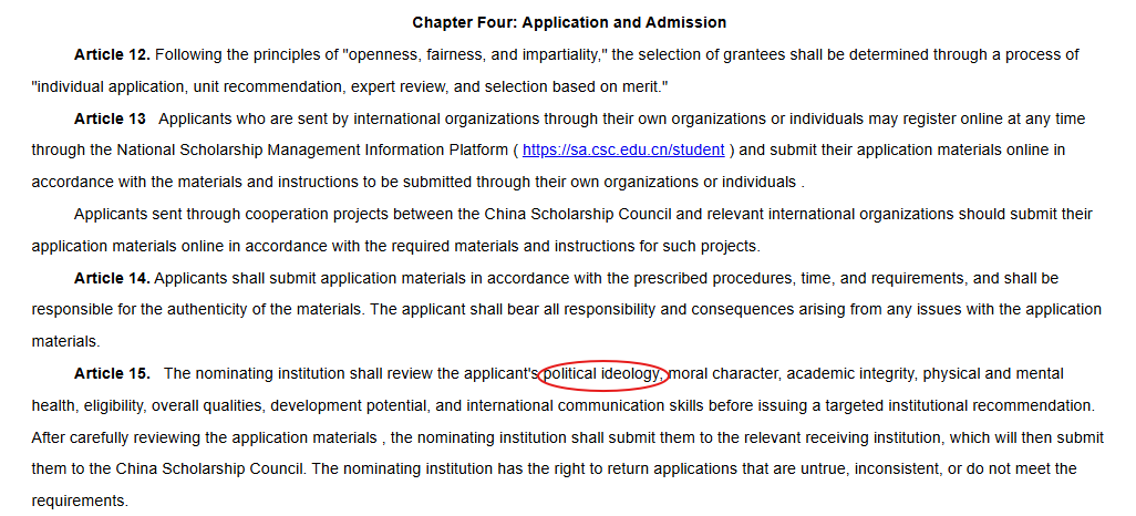 “Applicants must support the leadership of the Communist Party of China and the socialist system with Chinese characteristics; love the motherland; possess good moral character; obey laws and regulations; and have a correct worldview, outlook on life, and values.”