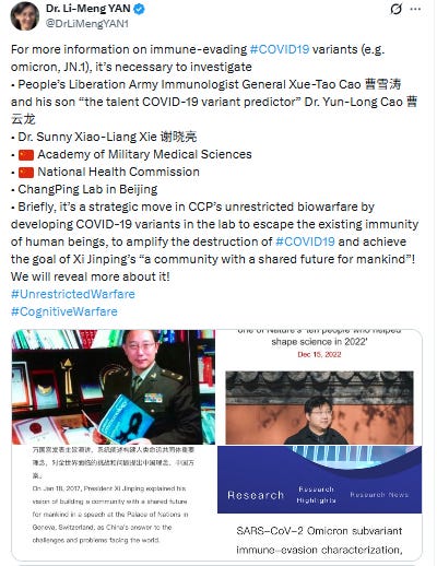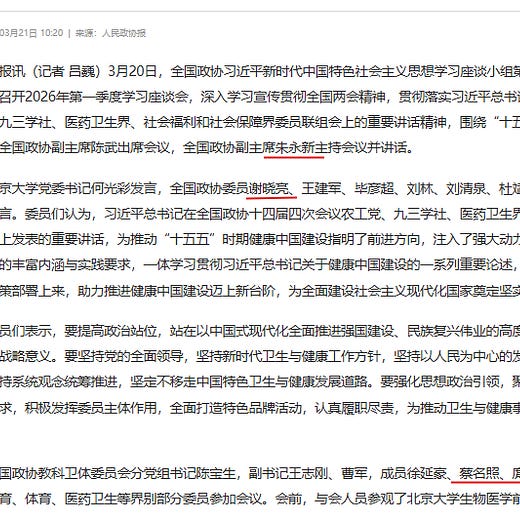 On March 20, 2026—the very day Tucker Carlson interviewed Jiang Xueqin—one of Jiang’s employer’s strategic advisors, Zhu Yongxin, was sitting in a high-level Beijing meeting with former senior CCP Central Propaganda Department officials Cai Mingzhao and Tuo Zhen, as well as Ding Xuedong, a Central Committee member. The meeting also included Xie Xiaoliang, tied to the PLA’s Academy of Military Medical Sciences. Public reports, including from Li-Meng Yan, highlight these same actors in networks connected to military-linked virology research, immune-evading COVID-19 variants, and state-directed scientific projects. The takeaway is clear: the people behind Jiang’s “independent” academic voice are deeply embedded in CCP political, propaganda, and military-scientific systems—a context that Tucker Carlson did not disclose to his audience.