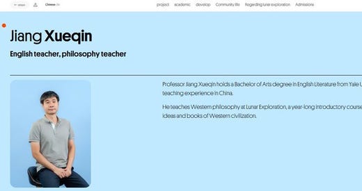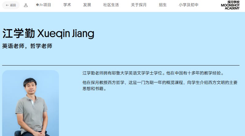 Since 2022, Jiang has been teaching at Moonshot Academy (Beijing Chaoyang District Moonshot School), a private non-profit institution operating under China’s regulatory framework.