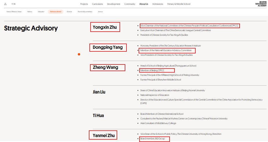 Moonshot Academy’s advisory structure adds another layer of complexity. Its Strategic Advisory Committee includes: