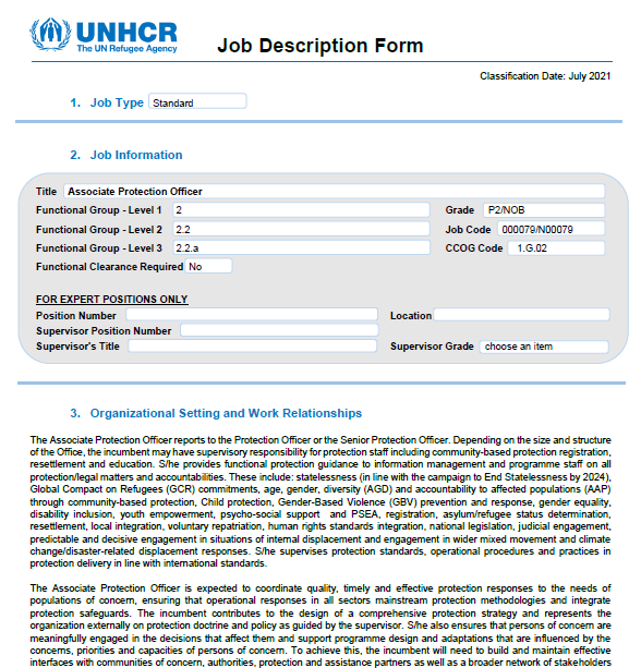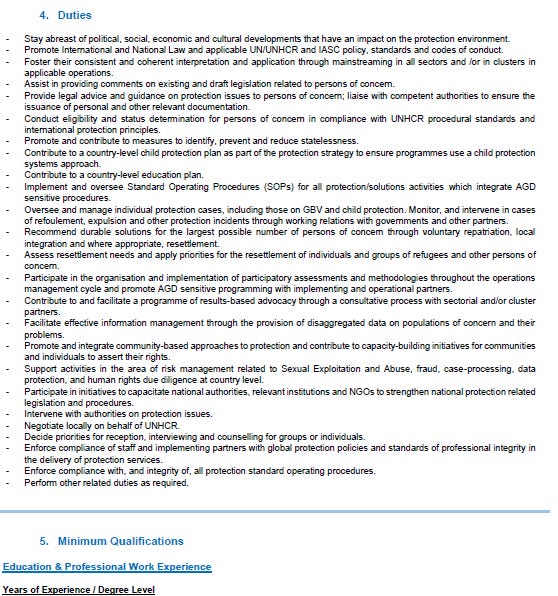 Duties: Monitor law and doctrine, draft legal advice, liaise with UNHCR divisions, contribute to protection strategy.