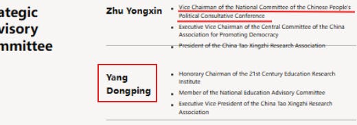 Another key figure on Moonshot Academy’s Strategic Advisory Committee is Yang Dongping, a highly influential educator and scholar with deep ties to China’s elite academic and political structures. Yang is a professor and director at the Beijing Institute of Technology’s Education Research Institute, specializing in higher education theory, modernization, and educational equity. His career spans decades of leadership in CCP-aligned research and advisory bodies: he serves on the National Education Advisory Committee, is the executive vice president of the China Tao Xingzhi Research Society, and holds multiple roles in China’s private education and strategic development associations. Yang has authored research on China’s educational modernization, including the book A Difficult Sunrise, and has supervised graduate programs in higher education. His advisory role at Moonshot Academy, combined with his institutional connections, signals that the school’s governance is closely intertwined with CCP-influenced educational thought, reinforced by his affiliation with Beijing Institute of Technology, an institution designated by the U.S. Department of Commerce for national security concerns.