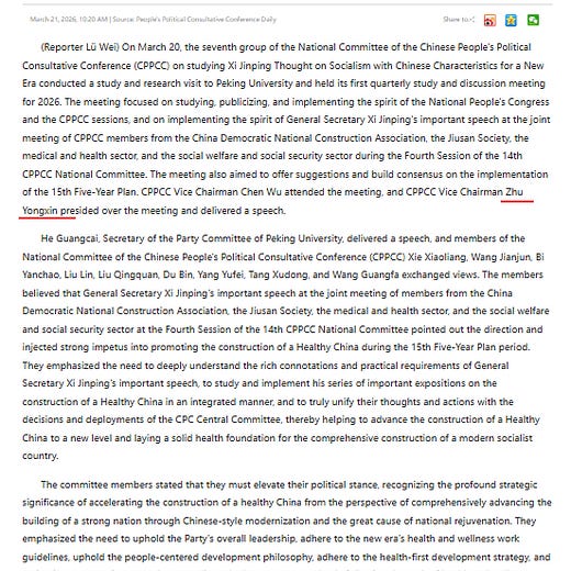 On March 20, 2026—the same day Tucker Carlson interviewed Jiang Xueqin—Zhu Yongxin, a strategic advisor to Jiang Xueqin’s employer Moonshot Academy, was participating in a high-level political study session at Peking University. The meeting brought together senior figures from the CCP’s propaganda and policy apparatus, including two former CCP Central Propaganda Deputy Ministers Cai Mingzhao and Tuo Zhen, and focused on implementing Xi Jinping’s directives and strengthening political alignment. While the overlap in timing may be coincidental, it underscores a broader reality: individuals connected to Jiang’s institutional network are actively embedded in ongoing high-level Party political processes.