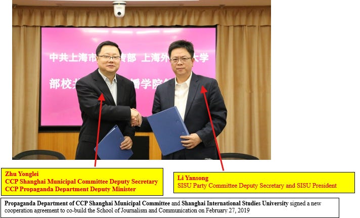 It was disclosed that on February 27, 2019, the Propaganda Department of CCP Shanghai Municipal Committee and Shanghai International Studies University (SISU) signed a new cooperation agreement to co-build the School of Journalism and Communication. The ceremony took place at the Propaganda Department, with attendance by CCP Shanghai Municipal Committee Deputy Secretary and Propaganda Department Deputy Minister Zhu Yonglei(朱咏雷), SISU Party Committee Deputy Secretary and President Li Yansong, senior leadership from the Propaganda Department’s News, Cadre, Development, and Public Opinion Offices, and the SISU School of Journalism and Communication Party and administrative leadership. The signing was hosted by Sun Weixing, Director of the Department’s Co-Build School Leadership Group Office.