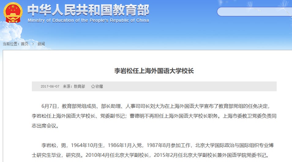 Li Yansong’s transfer to SISU on June 7, 2017 signaled a consolidation of CCP ideological control over foreign-language and international communication institutions. His appointment directly aligned with the Party’s strategic goal of transforming universities into instruments of “international discourse power” (国际话语权) — cultivating cadres who can project the CCP’s narratives abroad under the guise of global academic or media engagement.