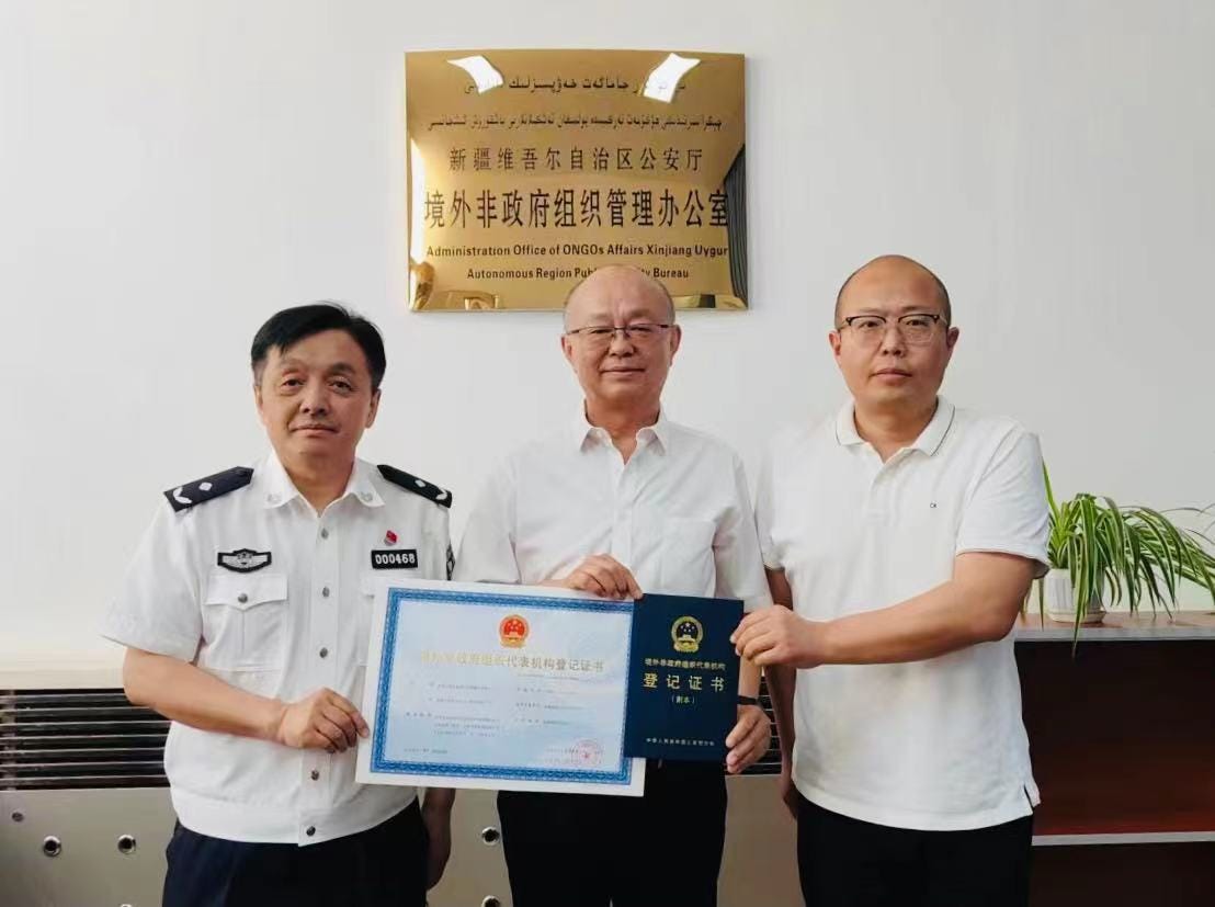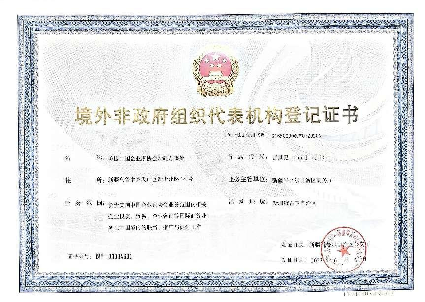 On June 15, 2023, the Xinjiang Uygur Autonomous Region Department of Commerce officially approved the establishment of a USA China Entrepreneurs Association (UCEA, 美国中国企业家协会) representative office in Xinjiang. The office received its Foreign NGO Representative Office Certificate from the Xinjiang Public Security Bureau’s Office for the Administration of Overseas NGOs, underscoring direct CCP supervision. Images from the ceremony show personnel in CCP Public Security uniforms, signaling security sector involvement in the office’s formal inauguration.