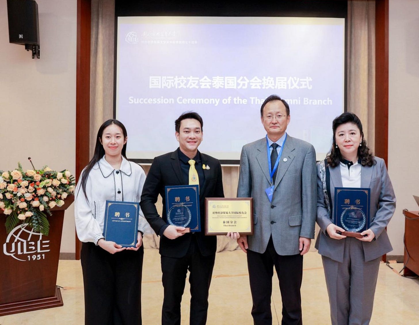 UIBE used the forum to formalize leadership for overseas alumni chapters — appointments personally handed out by CCP Party Secretary Huang Baoyin and President Zhao Zhongxiu: