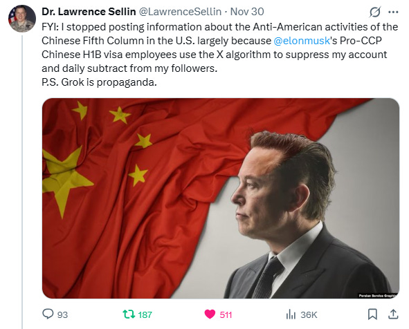 He stopped posting about “Anti-American activities of the Chinese Fifth Column in the U.S.” largely because, according to him, pro-CCP Chinese H-1B employees at X used algorithmic tools to suppress his account and reduce his follower count.