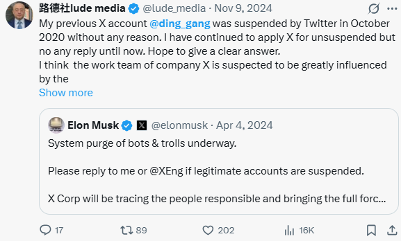 Users claim that X has restricted or shadow-suppressed accounts discussing early origin disclosures, including the account @ding_gang, whose owner proactively requested reinstatement but it was not restored.