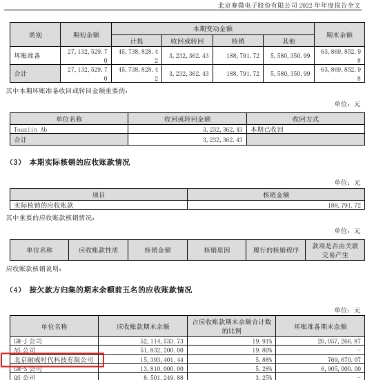 A key piece of evidence demonstrating that the divestment of Beijing Naiwei Shidai Technology Co., Ltd. (“Naiwei Shidai”) did not represent a clean or complete exit from military-related business lies in Sai MicroElectronics Inc.’s 2022 Annual Report. As of year-end 2022—well after the equity transfer was completed and Naiwei Shidai had been removed from the consolidated scope—Naiwei Shidai remained one of the top five debtors of Sai MicroElectronics, with an outstanding accounts receivable balance of RMB 15.39 million, representing 5.88% of total accounts receivable, and accompanied by a specific bad-debt provision of RMB 0.77 million. This post-divestment receivable balance confirms that substantive commercial transactions continued between the parties after the alleged “strategic exit.” Given Naiwei Shidai’s well-documented role in inertial navigation systems, weapons-equipment certification, and deployment on military aircraft, the persistence of material receivables indicates ongoing operational and financial linkage, contradicting any assertion that the transaction’s purpose was to fully disengage from defense or military-industrial activities. The transaction therefore functioned as a corporate restructuring of ownership, not a genuine cessation of exposure to military supply chains.